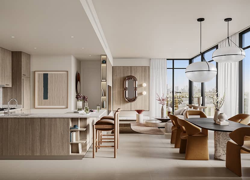 Its close proximity to the Dubai Metro lines will provide swift and effortless access to airports and neighbouring emirates in the near future. The off-plan apartment development showcases an enchanting modern contemporary architectural design, characterized by sleek lines and a timeless aesthetic. The deliberate placement of the buildings allows for panoramic views of the lush surroundings, creating a tranquil ambiance.